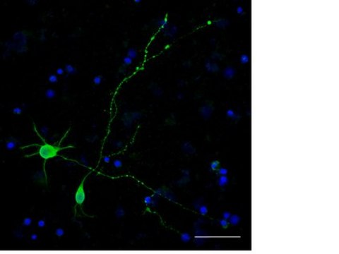 Antibodies to neuronal proteins have become critical tools for identifying neurons and discerning morphological characteristics in culture and complex tissue. While the labeling from classic histological techniques, such as Golgi staining, and modern molecular approaches, such as GFP constructs, yield excellent cytoarchitectural detail, these approaches are technically challenging and impractical for many neuroscience research needs. Neuron-specific antibodies are convenient precision tools useful in revealing cytoarchitecture, but are limited to the protein target distribution within the neuron, which may differ greatly from nucleus to soma to dendrite and axon. To achieve as complete a morphological staining as possible across all parts of neurons, Millipore previously developed a monoclonal antibody blend (Catalog No. MAB2300) that reacts against key somatic, nuclear, dendritic, spine, and axonal proteins distributed across the pan-neuronal architecture. Now Millipore has formulated MAB2300X, an Alexa 488 conjugated version of the pan-neuronal antibody blend MAB2300 to facilitate immunofluorescence studies. Each antibody within the blend is conjugated to Alexa 488 therefore enabling detection of an entire neuron with only one microscopic emission channel. MAB2300X has been validated in diverse fixations, cell culture, and immunohistochemistry protocols, giving researchers a convenient and specific qualitative and quantitative tool for studying neuronal morphology. High morphological resolution has been achieved using MAB2300x including distral dentrites and spines.
