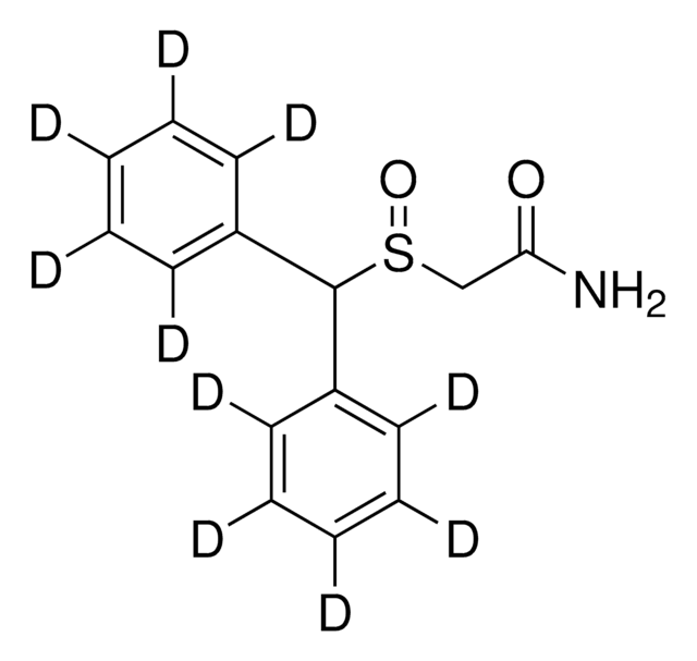 A new internal standard suitable for numerous GC/MS and LC/MS applications from clinical toxicology testing and forensic analysis to urine drug testing and isotope dilution methods. Modafinil is an analeptic drug sold under the brand names Provigil® or Modavigil® and approved by the US FDA for the treatment of narcolepsy, shift work sleep disorder, and excessive daytime sleepiness. A well known nootropic, the drug is often used as a performance-enhancer in academics and sports.