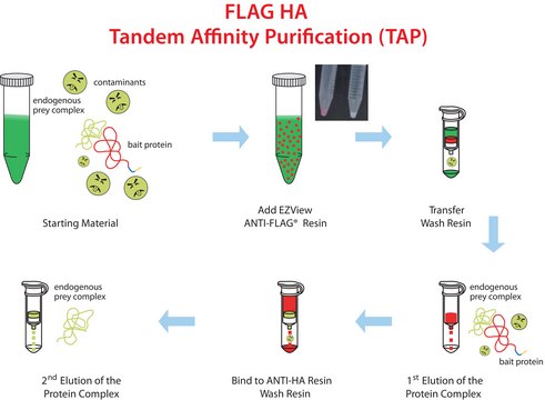 The FLAG® HA Tandem Affinity Purification Kit is designed for the isolation of high purity FLAG-HA dual-tagged fusion proteins from complex matrix, such as cell lysates and tissue homogenates. The kit is particularly suitable for isolation of protein complexes using TAP (Tandem Affinity Purification) technology.