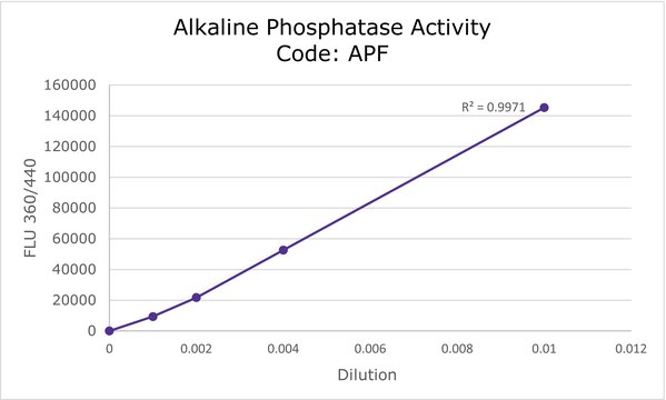 The Alkaline Phosphatase (AP) Kit uses a fluorometric assay to detect AP activity. The kit capability is linear over a wide range of enzyme concentrations, which makes it particularly well suited for comparative analysis.