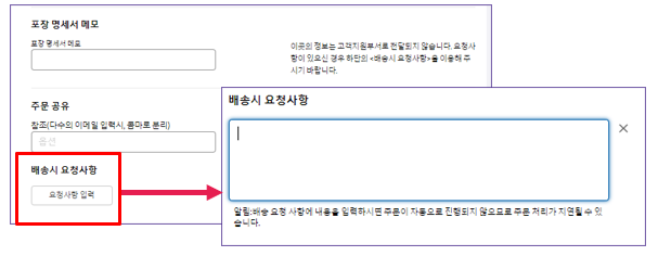 A: At the last stage of the order process, click on Delivery Requests, enter information, and then proceed with the order, and you can place an order together with your request. However, please note that if you leave a request for delivery, your order processing may be delayed as the entered information will be forwarded to the customer support department and will not be processed automatically. In addition, the information recorded in the memo on the packing specification cannot be checked by the customer support department before shipment, so please be sure to fill it out in the Delivery Requests section.