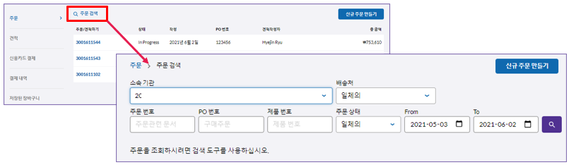 A: You can check latest orders at Account → Orders. And if you click Order Search, you can search with various options. Please click to check in details.