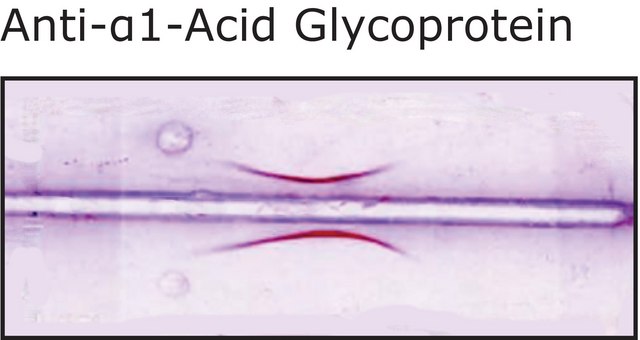 Goat Anti-α1-Acid Glycoprotein antibody is immunospecific for human α1-acid glycoprotein by immunoelectrophoresis versus human serum and α1-acid glycoprotein.