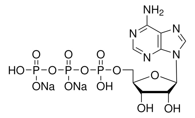 Adenosine 5′-triphosphate disodium salt solution is suitable for use in molecular biology applications such as kinase reactions or DNA-dependent RNA polymerase transcription.