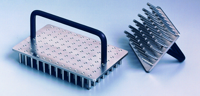 For the efficient transfer of bacterial colonies from 96 well multiwell plates to agar plates or nitrocellulose membranes.