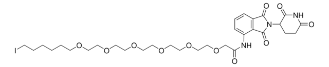 Protein degrader builiding block Pomalidomide-PEG6-butyl iodide enables the synthesis of molecules for targeted protein degradation and PROTAC (proteolysis-targeting chimeras) technology. This conjugate contains a Cereblon (CRBN)-recruiting ligand, a linker with both hydrophobic and hydrophilic moieties, and a pendant iodoalkane for reactivity with a nucleophilic group on a target ligand. Because even slight alterations in ligands and crosslinkers can affect ternary complex formation between the target, E3 ligase, and PROTAC, many analogs are prepared to screen for optimal target degradation. When used with other protein degrader building blocks with a pendant iodo group, parallel synthesis can be used to more quickly generate PROTAC libraries that feature variation in crosslinker length, composition, and E3 ligase ligand.