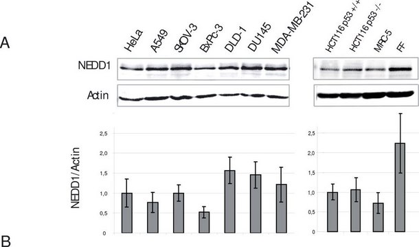 MAB1501 is a pan-actin antibody that binds to an epitope in a highly conserved region of actin; therefore, this antibody reacts with all six isoforms of vertabrate actin (Lessard, 1988). Reacts with both globular (G) and fillimentous (F) forms of actin and does not interfere with actin polymerization to form filaments, at a ratio as high as one antibody per two actin monomers. However, this antibody does increase the extent of polymerization when used at a lower ratio of antibody to actin. In addition to labeling myotubes, anti-actin stains myoblasts and fibroblasts. Although clone C4 is prepared as an antibody to chicken gizzard muscles actin, it reacts with actins from all vertebrates, as well as with Dictyostelium discoideum and Physarum polycephalum actins (Lessard, 1988).