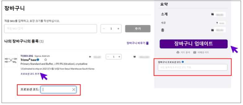 2. 프로모션 코드 입력란이 열리면, 코드를 입력한다. 만약 장바구니에 담긴 모든 품목에 프로모션 코드를 적용을 해야할 경우, 오른쪽 장바구니 프로모션 코드란에 코드를 입력한다.