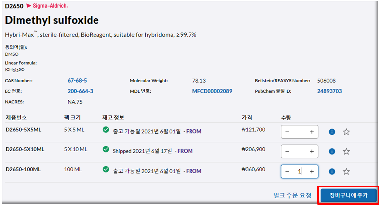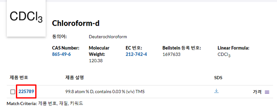 - 재고와 납기, 가격 확인은 로그인 하신 후 조회하시기 바랍니다. 로그인 하지 않은 경우 부정확한 정보가 보여질 수 있습니다. 또한 씨그마알드리치 주문 계정과 연동된 로그인 아이디로 로그인 하셔야 보다 정확한 정보를 확인하실 수 있습니다.