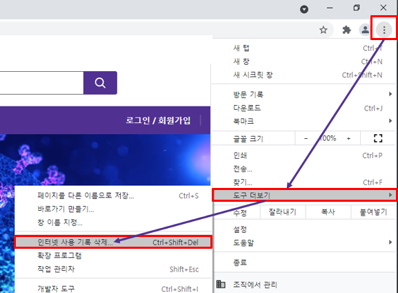 - 구글 크롬 브라우저를 사용하고 계신 경우, CTRL+SHIFT+DEL 키를 누르신 후 쿠키와 히스토리 항목을 선택하여 삭제하신 다음 브라우저를 재 시작하는 방법으로 해결하실 수 있습니다.