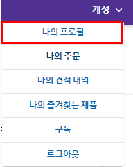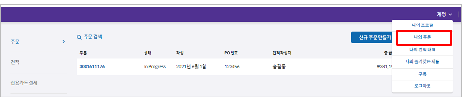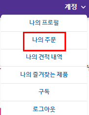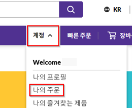 1. 화면 오른쪽 상단의 “계정” 하위 메뉴 중, 나의 주문을 클릭합니다.