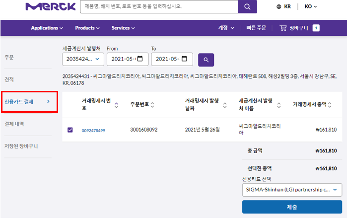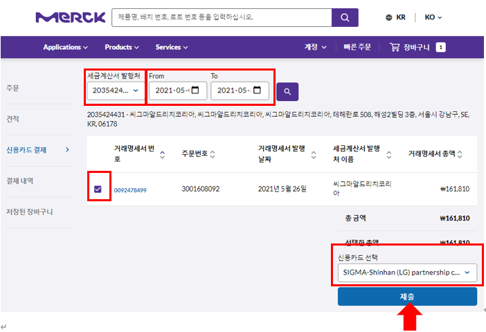 2. From / To 를 클릭해 검색을 수행할 기간을 설정할 수 있습니다. 세금계산서 발행처를 클릭하셔서 공급받는 자 항목을 선택하셔야 할 경우 본 화면에서 선택하실 수 있습니다. 결제할 거래명세서 번호 앞에 클릭하시고 신용카드를 선택(선결의 경우 신한카드만 가능합니다)하시고 제출을 클릭합니다. (링크가 보이지 않는다면 로그인 상태를 다시 한 번 확인해 보시기 바랍니다.)