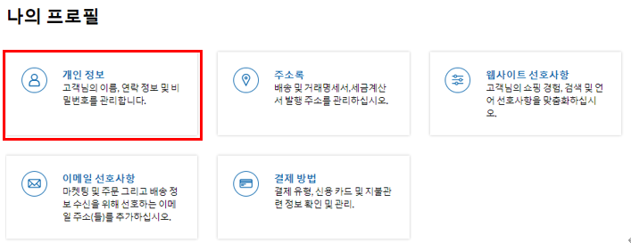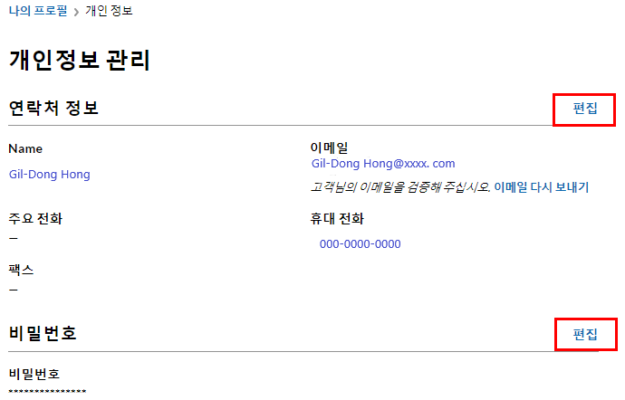 1. 나의 프로필: 로그인 후 상단 네비게이션 바의 계정 > 나의 프로필을 클릭하여 확인할 수 있습니다. 이름과 전화번경의 변경이 필요할 경우, 개인정보 하위메뉴를 선택한 후 연락처 정보 옆 편집을 클릭하면 변경이 가능합니다. *이메일은 아이디 생성시 입력한 고유한 정보이므로 변경하실 수 없습니다. 비밀번호 옆 편집을 클릭하면 요건에 맞춰 비밀번호를 변경하실 수 있습니다. (변경 후 반드시 저장버튼을 클릭하여 주시기 바랍니다.)