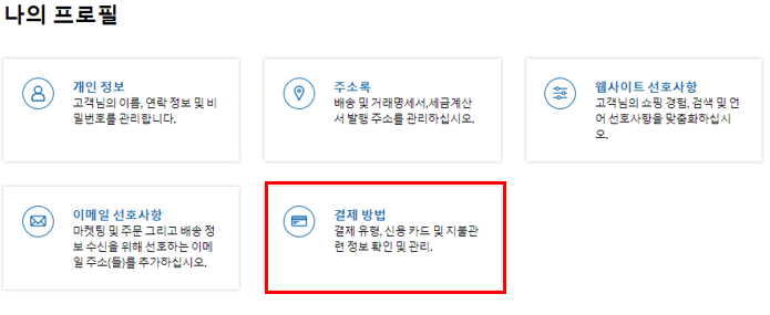 1. 홈페이지의 계정의 나의 주문을 클릭하고 신용카드 결제를 클릭합니다.
