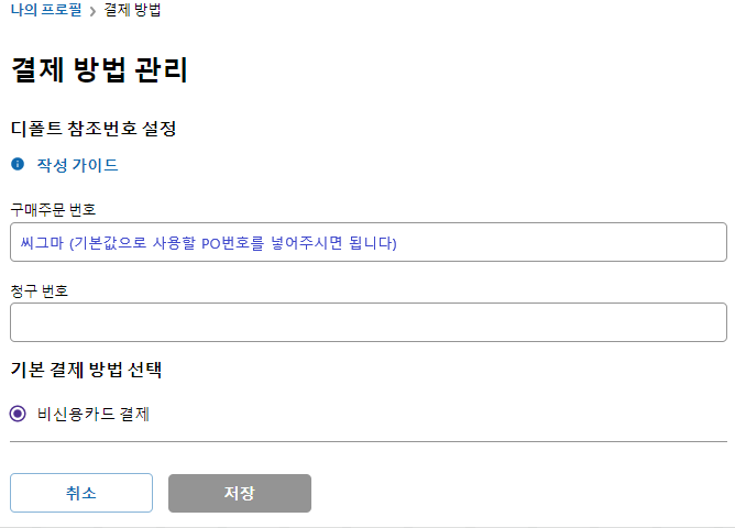 5. 결제방법: 기본값으로 사용하고자 하는 PO를 구매주문번호 필드에 저장하시면, 주문 진행 시 장바구니에 해당 PO번호가 자동으로 입력됩니다.
