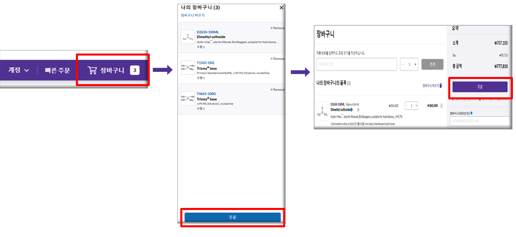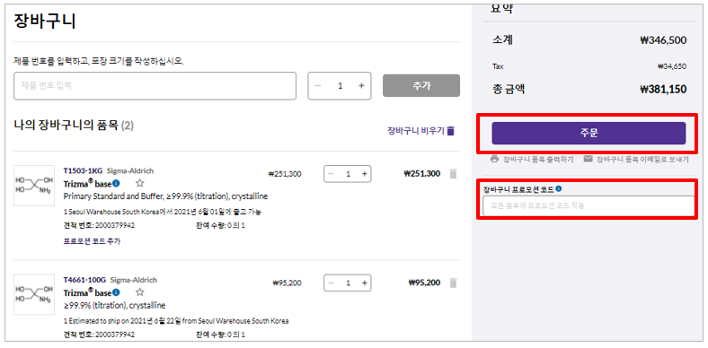 씨그마알드리치의 제품 주문은 다음과 같은 두 단계로 진행됩니다.