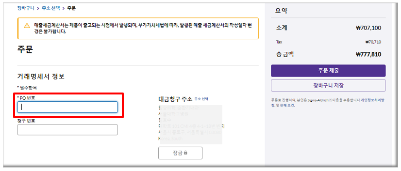 3. PO번호 (발주번호)란은 고객님께서 설정해 주시는 내용입니다. 본 란은 주문의 성격에 따라 다양한 용도로 이용하실 수 있으며, 추후 직접 주문을 검색하실 떄 유용하게 사용하실 수 있습니다. PO번호 (발주번호)는 반드시 입력되어야 하며 빈칸으로 남겨져 있으면 주문이 진행되지 않으므로 따로 이용하실 내용이 없더라도 주문날짜 또는 주문자 성명 등을 입력하여 주문을 진행해 주시기 바랍니다.