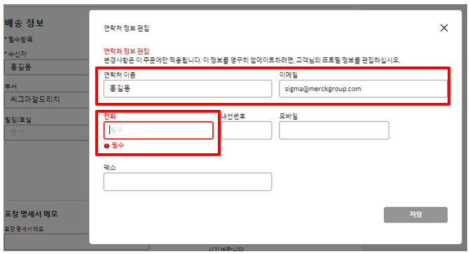 4. 연락처 정보란이 빈칸으로 되어 있으면 주문이 진행되지 않으니, 이름, 연락처, 이메일의 정보를 입력 하신 후 저장하셔서 정보가 제대로 기입되어 있는 지 확인 후 진행 부탁드립니다. 해당 정보는 당사 시스템에만 기록되는 정보로 제품 배송에 영향을 주지 않습니다. 귀하의 계정에 해당정보를 기록해두시면 매번 입력하지 않으셔도 됩니다.
