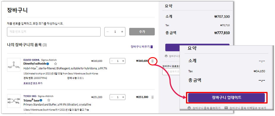 씨그마알드리치의 제품 견적은 다음과 같은 두 단계로 진행됩니다.