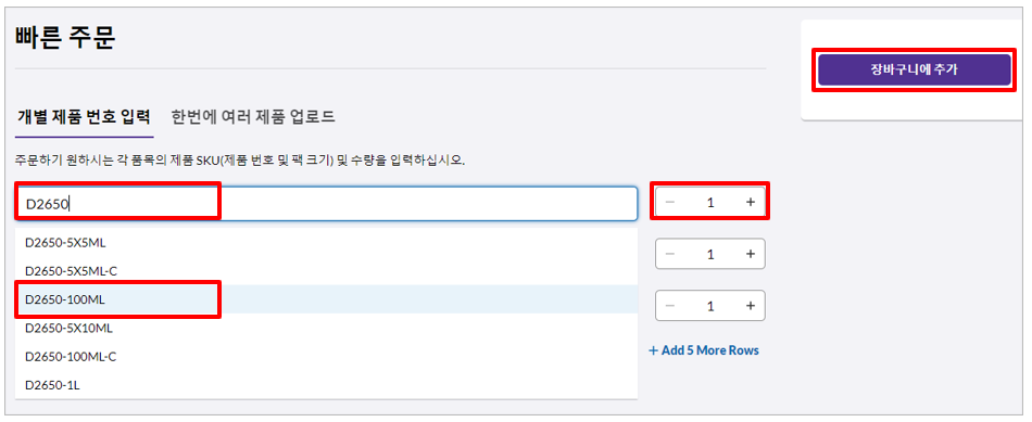 2. 제품번호를 입력한 후 제품 용량 선택 및 수량을 입력하고, 장바구니에 추가 버튼을 클릭합니다. (용량을 알고 계신 경우 제품번호와 용량을 함께 기입하시면 보다 빠르게 주문을 입력할 수 있습니다.)