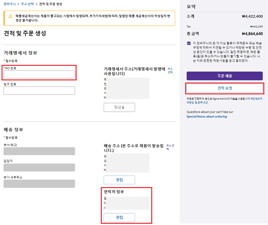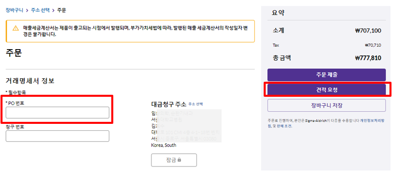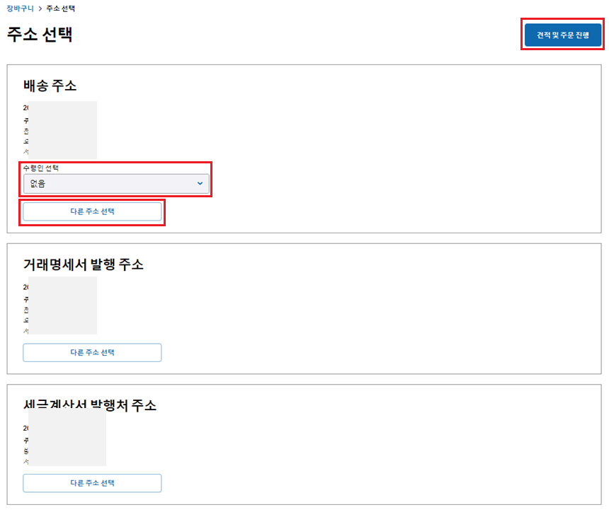 2. 배송주소, 수령인, 거래명세서 및 세금계산서 발행주소를 확인 한 후 견적 및 주문진행을 클릭합니다.
