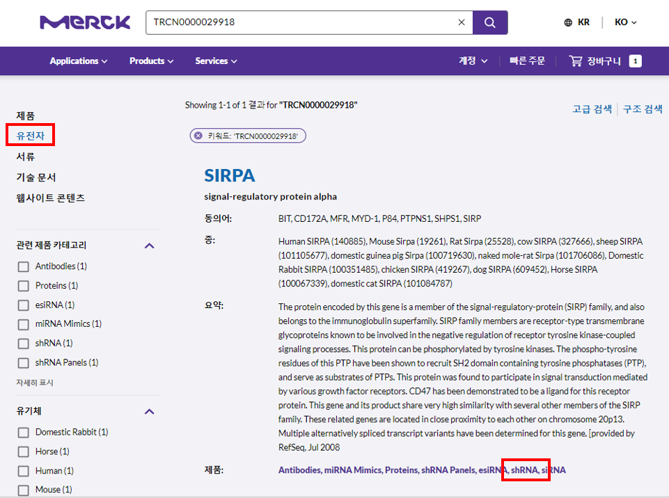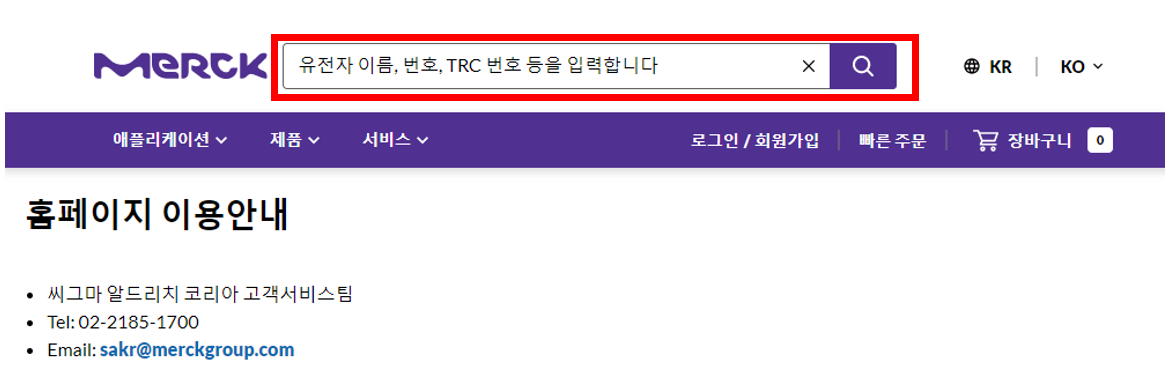 1. 화면 상단 검색창에 제품번호, CAS번호, 유전자 이름 등을 입력한 후 검색을 시작합니다.