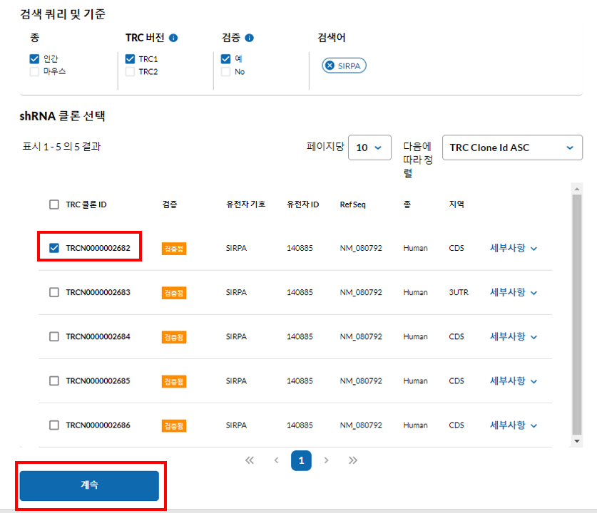 유전자 이름, 번호, TRC 번호 등으로 검색합니다. (ex. DYRK1A 또는 1234, 또는 TRCN0000029918 등)