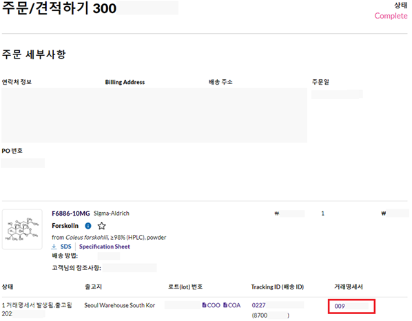 3. 주문 정보 페이지 내 거래명세서 번호를 클릭하여 거래명세서를 확인하실 수 있습니다.