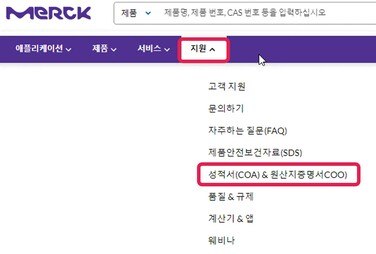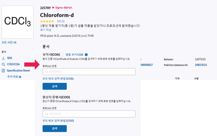 3. 제품 정보 페이지 왼쪽의 COA를 클릭하면 화면 하단 문서의 성적서(COA)로 이동합니다. 로트(lot)번호를 입력하여 CoA를 확인하실 수 있습니다