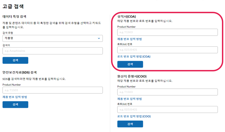 2. 고급검색 화면에서 성적서(COA) 항목에 제품번호(Product Number)와 로트(lot) 번호 또는 소스 로트(Source Lot)를 입력하신 후 확인 버튼을 클릭하시면 해당 CoA를 확인하실 수 있습니다. 이 때 제품번호 입력란에 pack size는 제외하고 입력하십시오. (예: T1503-25G의 경우 용량을 제외하고 T1503만 입력)