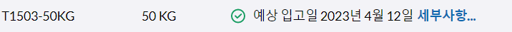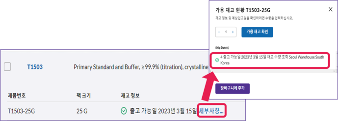 - '세부사항'을 클릭후 보이는 팝업창에서, 원하시는 수량 입력후 가용 재고확인 버튼을 누르면, 출고가능일과 수량이 보이게 됩니다. 이 때 출고가능일이 오늘 날짜로 보이면,국내 재고가 있어 당일 배송한 상태입니다. 다만, 가용재고수량은 실시간 변동될 수 있어, 주문 후, 확정된 일정을 확인 받으시길 바랍니다.