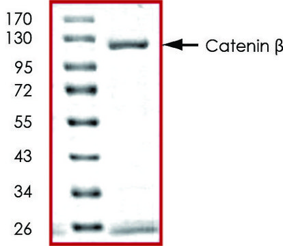 β-catenin interacts with T-cell factor and lymphoid enhancer-binding factor (TCF and LEF) transcription factors and is an essential member of the Wingless-Wnt signal transduction pathway. The adenomatous polyposis coli (APC) tumor-suppressor protein, together with Axin and glycogen synthase kinase 3 β (GSK3β), form a Wnt-regulated signaling complex that mediates phosphorylation-dependent degradation of βcatenin by the proteasome. APC and the Siah-1 E3 ubiquitin-protein ligase-1 mediate a novel β-catenin degradation pathway linking p53 activation to cell cycle control. Activating mutations in the human β-catenin gene have been found in human colon cancer and melanomas. The protein has a role in homeostasis and development.