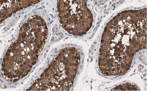 Immunohistochemistry (Paraffin) Analysis: A 1:100 dilution from a representative lot detected HSP90 alpha in human testis tissue sections.