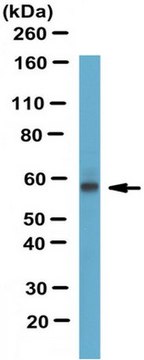 ~58 kDa observed. A homodimeric trimer of three hCE-1 molecules may be observed at ~190 kDa in some cell lysates (Prof. P. Potter, St. Jude Children′s Research Hospital, Memphis.).