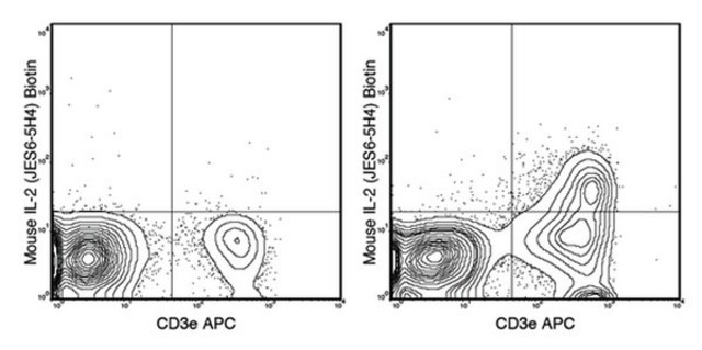 Flow Cytometry Analysis: 0.06 μg from a representative lot detected IL-2 in one million C57Bl/6 splenocytes.