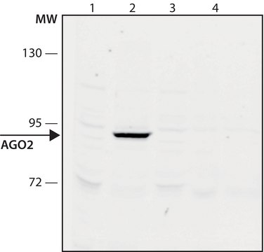 immunoblotting: 2-4 μg/mL using extract of HEK-293T cells transfected with human AGO2, immunoprecipitation (IP): 10-20 μg/test using HeLa cells extract
