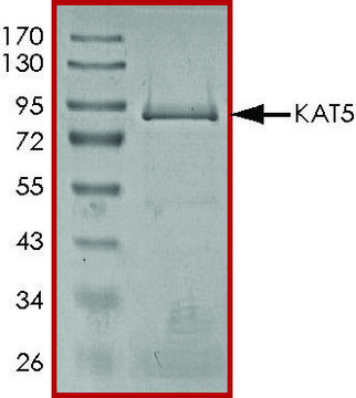 Full-length recombinant human KAT5 was expressed by Baculovirus in Sf9 insect cells using an N-terminal GST tag. KAT5 or K (lysine) acetyltransferase 5 is a signaling protein that belongs to the MYST family of histone acetyl transferases (HATs). KAT5 was originally isolated as an HIV-1 TAT-interactive protein that plays an important role in regulating chromatin remodeling, transcription and other nuclear processes by acetylating histone and nonhistone proteins (1). KAT5 protein is a histone acetylase that is involved in DNA repair and apoptosis and plays an important role in signal transduction. KAT5 acts as a cofactor of TAT that is involved in the regulation of HIV gene expression. KAT5 is also a co-regulator of transcription factors that either promote or suppress tumorigenesis (2).