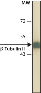 Monoclonal Anti- β-Tubulin II (mouse IgG1 isotype) is derived from the hybridoma 7B9 produced by the fusion of mouse myeloma cells and splenocytes from BALB/c mice immunized with a synthetic peptide corresponding to a fragment at the C-terminus of human β?tubulin II. Tubulin is the major building block of microtubules. This intracellular, cylindrical, filamentous structure is present in almost all eukaryotic cells. Tubulin is a heterodimer that consists of α-tubulin and β ?tubulin. Both subunits have a molecular mass of ~50 kDa and share considerable homology.