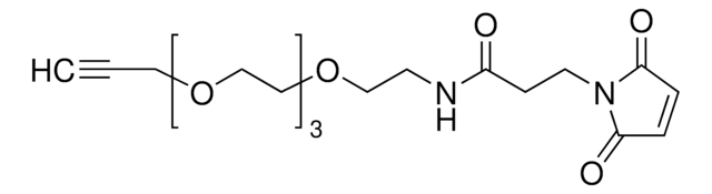 Heterobifunctional crosslinker enabling the connection of an azide containing compound or biomolecule to one with a thiol. The maleimide group will react preferentially with thiols to form a covalent adduct and the terminal alkyne will react with azides via copper-catalyzed 1,3-dipolar cycloaddition click chemistry. The hydrophilic PEG spacer adds to the water solubility of this reagent, allowing for easy modification cysteine containing biomolecules such as antibodies, proteins and peptides with the terminal alkyne. The PEG spacer also reduces aggregation of modified proteins stored in solution by adding hydrophilic character.