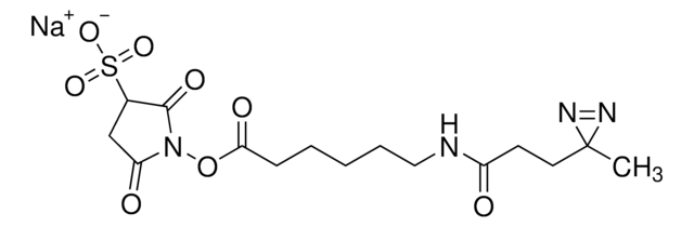- Heterobifunctional—NHS ester group reacts with primary amines at pH 7 to 9 to form covalent amide bonds; diazirine (azipentanoate) group reacts efficiently with any amino acid side chain or peptide backbone upon activation with long-wave UV light (330-370 nm)