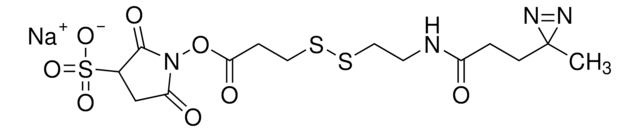 - Heterobifunctional—NHS ester group reacts with primary amines at pH 7 to 9 to form covalent amide bonds; diazirine (azipentanoate) group reacts efficiently with any amino acid side chain or peptide backbone upon activation with long-wave UV light (330-370 nm)