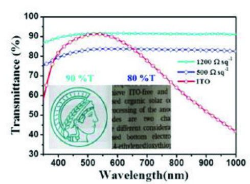 500 Ω/sq, 20 nm film: 80% transmittance