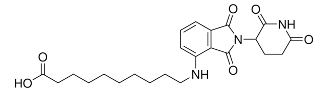 Protein degrader builiding block Pomalidomide-C9-CO2H enables the synthesis of molecules for targeted protein degradation and PROTAC (proteolysis-targeting chimeras) technology. This conjugate contains a Cereblon (CRBN)-recruiting ligand and an alkyl-chain crosslinker with pendant carboxylic acid for reactivity with an amine on the target ligand. Because even slight alterations in ligands and crosslinkers can affect ternary complex formation between the target, E3 ligase, and PROTAC, many analogs are prepared to screen for optimal target degradation. When used with other protein degrader building blocks with a pendant carboxyl group, parallel synthesis can be used to more quickly generate PROTAC libraries that feature variation in crosslinker length, composition, and E3 ligase ligand.