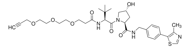 Protein degrader builiding block (S,R,S)-AHPC-PEG4-Alkyne enables the synthesis of molecules for targeted protein degradation and PROTAC (proteolysis-targeting chimeras) technology. This conjugate contains a von Hippel-Lindau (VHL)-recruiting ligand and a PEGylated crosslinker with pendant alkyne for click chemistry with an azide on the target ligand. Because even slight alterations in ligands and crosslinkers can affect ternary complex formation between the target, E3 ligase, and PROTAC, many analogs are prepared to screen for optimal target degradation. When used with other protein degrader building blocks with a pendant alkyne group, parallel synthesis can be used to more quickly generate PROTAC libraries that feature variation in crosslinker length, composition, and E3 ligase ligand.