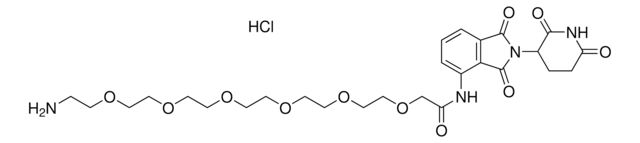 Protein degrader builiding block Pomalidomide-PEG6-NH2 (HCl salt) enables the synthesis of molecules for targeted protein degradation and PROTAC (proteolysis-targeting chimeras) technology. This conjugate contains a Cereblon (CRBN)-recruiting ligand and a PEGylated crosslinker with pendant amine for reactivity with a carboxyl group on the target ligand. Because even slight alterations in ligands and crosslinkers can affect ternary complex formation between the target, E3 ligase, and PROTAC, many analogs are prepared to screen for optimal target degradation. When used with other protein degrader building blocks with a pendant amine, parallel synthesis can be used to more quickly generate PROTAC libraries that feature variation in crosslinker length, composition, and E3 ligase ligand.