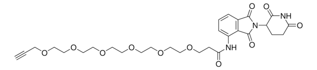 Protein degrader builiding block Pomalidomide-PEG6-Alkyne enables the synthesis of molecules for targeted protein degradation and PROTAC (proteolysis-targeting chimeras) technology. This conjugate contains a Cereblon (CRBN)-recruiting ligand and a PEGylated crosslinker with pendant alkyne for click chemistry with an azide on the target ligand. Because even slight alterations in ligands and crosslinkers can affect ternary complex formation between the target, E3 ligase and PROTAC, many analogs are prepared to screen for optimal target degradation. When used with other protein degrader building blocks with a pendant alkyne group, parallel synthesis can be used to more quickly generate PROTAC libraries that feature variation in crosslinker length, composition, and E3 ligase ligand.