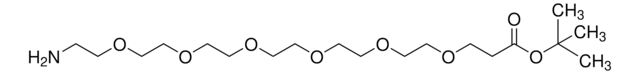 This heterobifunctional, PEGylated crosslinker features an amino group at one end and t-butyl-protected carboxyl group at the other, which can be deprotected with acidic conditions. The hydrophillic PEG linker facilitates solubility in biological applications. Amino-PEG6-t-butyl ester can be used for bioconjugation or as a building block for synthesis of small molecules, conjugates of small molecules and/or biomolecules, or other tool compounds for chemical biology and medicinal chemistry that require ligation. Examples of applications include its synthetic incorporation into antibody-drug conjugates or proteolysis-targeting chimeras (PROTAC® molecules) for targeted protein degradation.