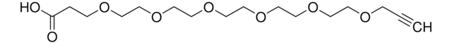 This heterobifunctional, PEGylated crosslinker features a carboxylic acid at one end and propargyl group at the other for reaction with azide-containing compounds using click chemistry. The hydrophilic PEG linker facilitates solubility in biological applications. Propargyl-PEG6-acid can be used for bioconjugation or as a building block for synthesis of small molecules, conjugates of small molecules and/or biomolecules, or other tool compounds for chemical biology and medicinal chemistry that require ligation. Examples of applications include its synthetic incorporation into antibody-drug conjugates or proteolysis-targeting chimeras (PROTAC® molecules) for targeted protein degradation.