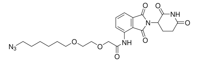 Protein degrader builiding block Pomalidomide-PEG2-Butyl Azide enables the synthesis of molecules for targeted protein degradation and PROTAC (proteolysis-targeting chimeras) technology. This conjugate contains a Cereblon (CRBN)-recruiting ligand, a linker with both hydrophobic and hydrophilic moieties, and a pendant azide for click chemistry with a target ligand. Because even slight alterations in ligands and crosslinkers can affect ternary complex formation between the target, E3 ligase, and PROTAC, many analogs are prepared to screen for optimal target degradation. When used with other protein degrader building blocks with a pendant azide group, parallel synthesis can be used to more quickly generate PROTAC libraries that feature variation in crosslinker length, composition, and E3 ligase ligand.