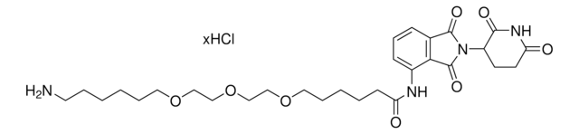 Protein degrader builiding block Pomalidomide-C6-PEG3-butyl amine (HCl salt) enables the synthesis of molecules for targeted protein degradation and PROTAC (proteolysis-targeting chimeras) technology. This conjugate contains a Cereblon (CRBN)-recruiting ligand, a linker with both hydrophobic and hydrophilic moieties, and a pendant amine for reactivity with a carboxyl group on the target ligand. Because even slight alterations in ligands and crosslinkers can affect ternary complex formation between the target, E3 ligase, and PROTAC, many analogs are prepared to screen for optimal target degradation. When used with other protein degrader building blocks with a pendant amine, parallel synthesis can be used to more quickly generate PROTAC libraries that feature variation in crosslinker length, composition, and E3 ligase ligand.
